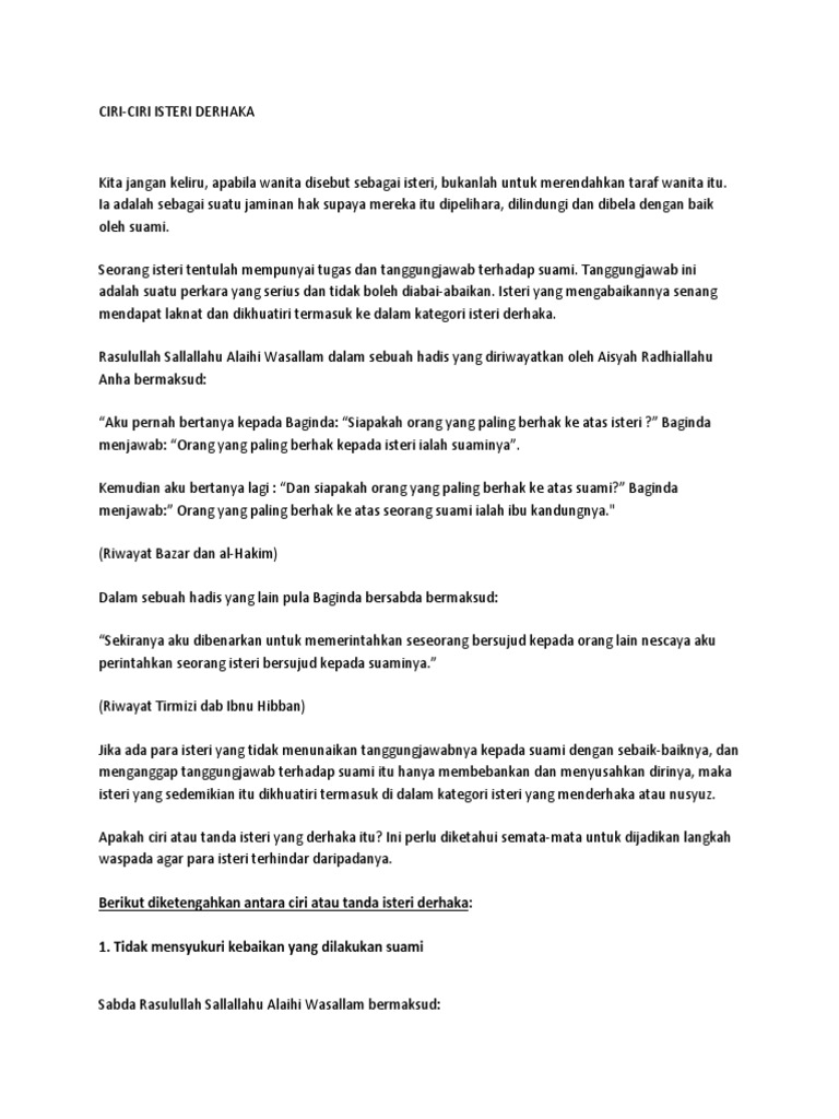 . Ciri-ciri Seorang Isteri Derhaka Kepada Suami. Perasaan kecil hati sedih dan kecewa tidak mengharuskan seorang isteri untuk melakukan sesuatu yang diharamkan dan membawa kepada nusyuz. Antara ciri-ciri isteri nusyuz.